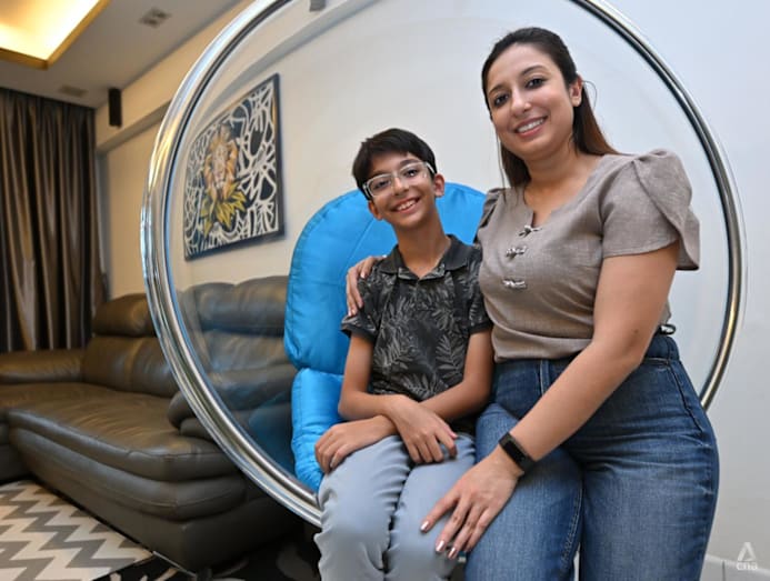 Mrs Shelina Singh looks on as her son Jayden uses his laptop at home on Apr 23, 2026. (Photo: CNA/Jeremy Long)