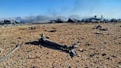 State media shared images of charred wreckage scattered across a desert area, with smoke still emanating from the site.